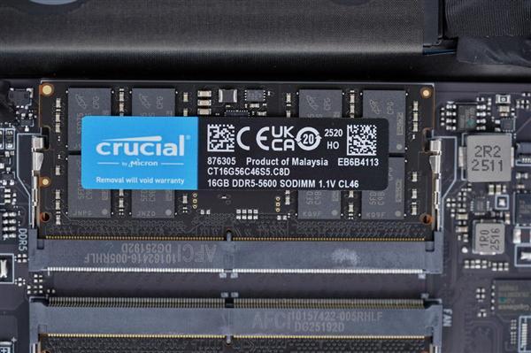 内存品牌为英睿达,DDR5—5600的版本速率。单面颗粒,由两根16GB组成32GB的双通道内存。