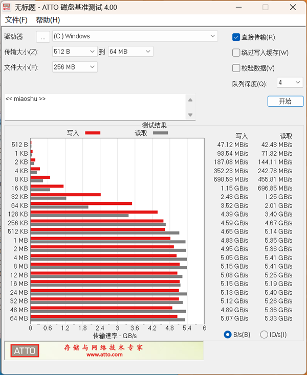 ATTO测试中,硬盘在最小的512B中有40MB左右的读写速度,在64KB后读取和写入均开始超过1GB/s,在512KB后硬盘基本达到最大速率。
