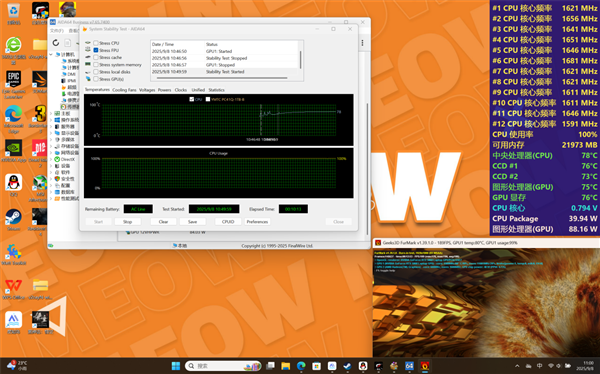 在静音游戏挡位,单烤CPU能运行在70W。双烤状态下,在开始烤机后的几秒,CPU功耗能跑到60W,之后稳定在40W,总性能分配为40W+90W。双烤10分钟后,CPU温度稳定在78度。GPU温度为75度。