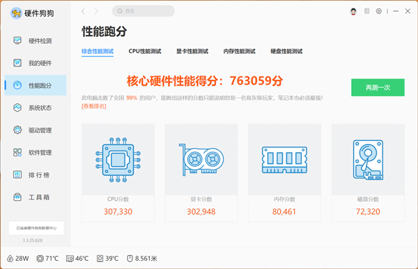 在硬件狗狗的测试中,总分为76.3W分,其中CPU得分30.7W分。