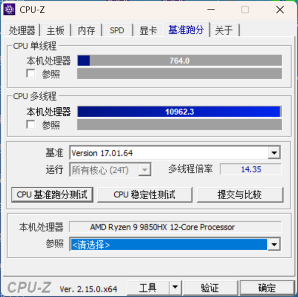 在CPU -Z的基准测试中,这颗CPU单线程达到了764分,多线程直接突破了1W分,达到了10962.3,接近1.1W。