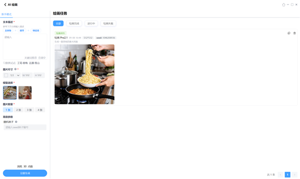 AI生图,输入提示词,选择尺寸,模型,数量即可一键生成,图片样式精细。