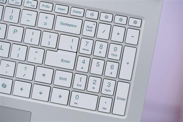 C面也是全金属,开机键位于键盘上方的中央区域,拥有全高十字键以及完整的小键盘区域,纯白的键帽相当好看。右上角的四颗性能专属按键,能够一键调整电脑运行时的风扇以及性能释放。