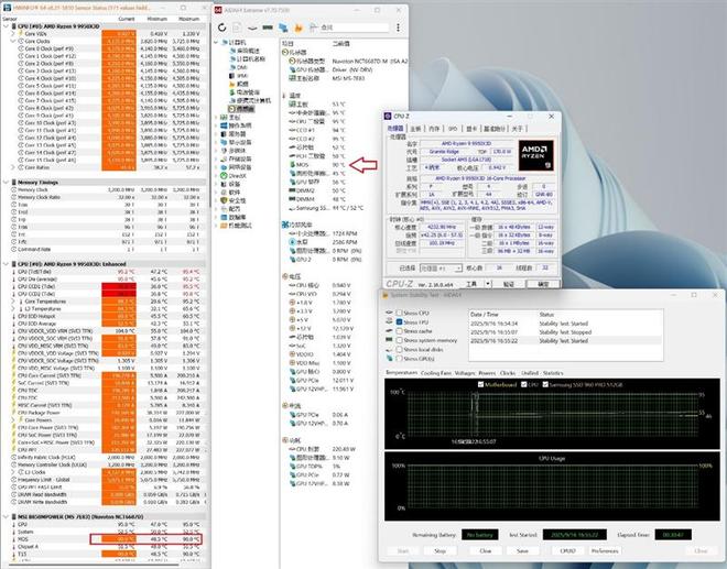 使用AIDA64 FPU拷机34分钟,锐龙5 9950X3D的功耗稳定在220W,全核频率4.2GHz,温度则是95度。