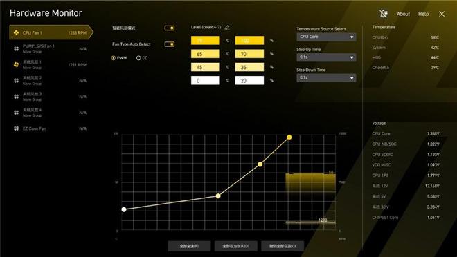 主板集成了2个4pin CPU风扇、4个4pin机箱风扇接口。6个风扇都可以单独依据CPU、MOS、主板或者机箱内部温度来设置温度曲线。