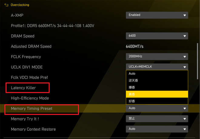 在BIOS中打开"延迟杀手",再将"Memory Timing Preset"设置为爆香。这里不太建议大家设置为逆天香,因为该选项会需求体质非常好的内存才能稳定。