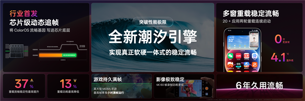 在芯片级动态追帧技术的赋能下,ColorOS 16的流畅性得以最大程度释放和展现,真正实现了从硬件到软件的全面流畅体验。除了重载,全新潮汐引擎还升级了久用技术,系统久用6年也能持久流畅,实现重载和久用双极限场景的双重流畅。