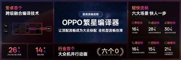 在繁星编译器的优化下,安卓Java核心接口性能提升了26%,整体负载降低14%。更重要的是,繁星编译器驱动编译算法效率提升,让没有顶配处理器的大众机,也能有"0卡顿、0延迟、0闪屏、0闪退、0闪跳、0卡死"的"六个0"流畅体验,让机圈德芙,既是顶配,也是标配。