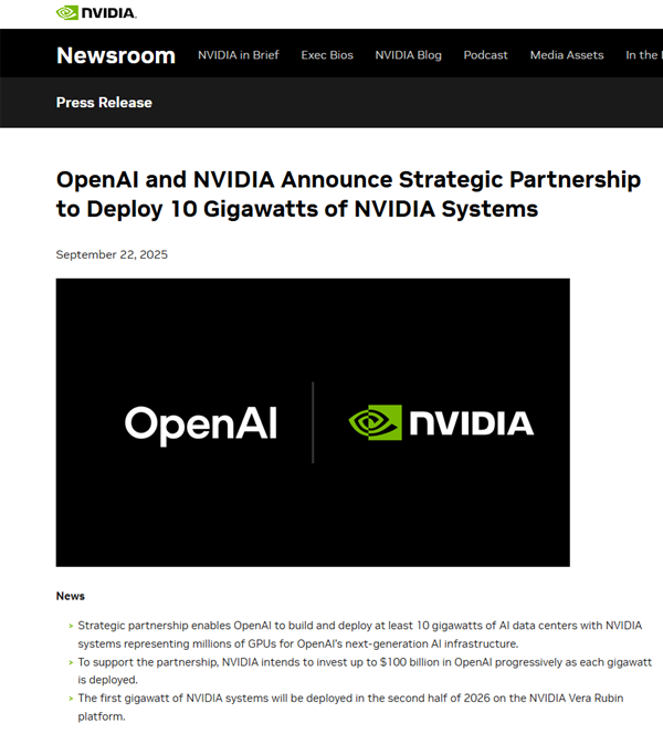 9月23日消息,据英伟达官网,日前,英伟达与OpenAI宣布达成合作,英伟达有意将逐步向OpenAI投资至多1000亿美元,用于支持数据中心及相关基础设施建设。