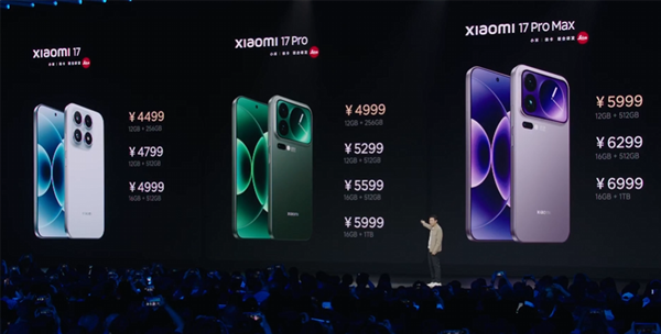 小米17 Pro:12+256GB 4999元;12+512GB 5299元;16+512GB 5599元;16GB+1TB 5999元。