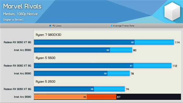 在《漫威蜘蛛侠:重制版》中,B580与AMD锐龙5 5600搭配时的性能表现有了巨大改善,从Intel 7028版本驱动(于8月发布)开始,B580的性能与RX 9060 XT 8GB显卡相当,相比6000系列驱动程序版本,性能提升了超过30%。