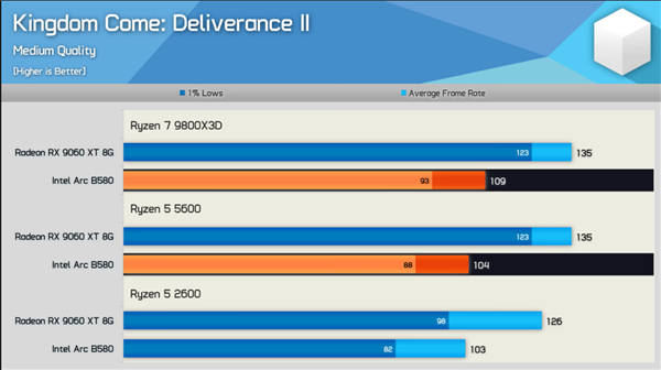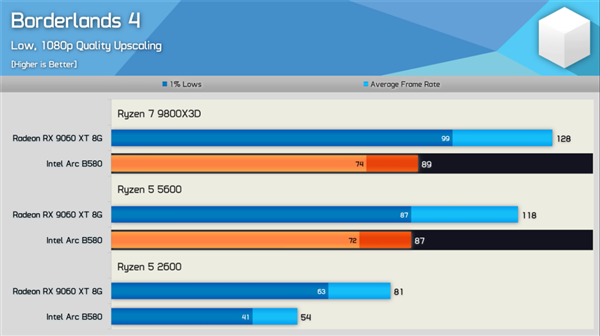 在《赛博朋克2077》中,B580当与锐龙5 2600搭配时,B580的性能与RX 9060 XT相当,没有出现性能下降的情况。