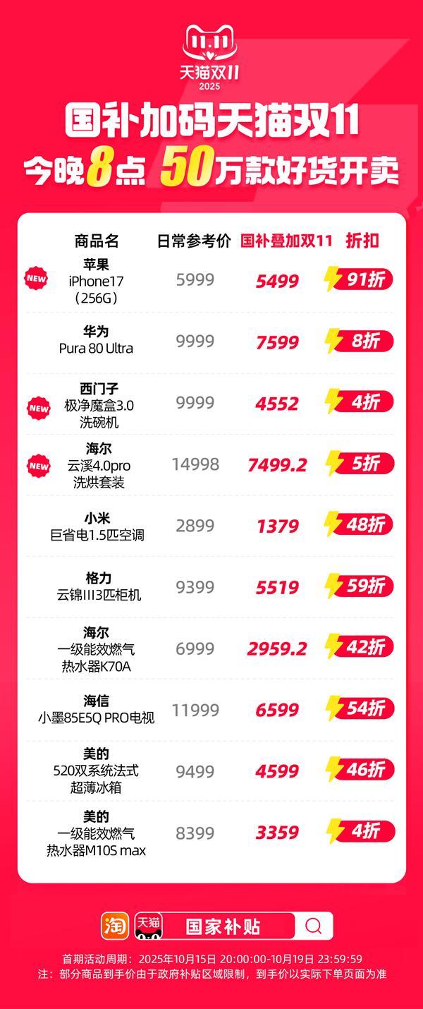 10月15日消息,2025年第四波国补资金重磅落地,今晚8点天猫双11国补5折开卖。