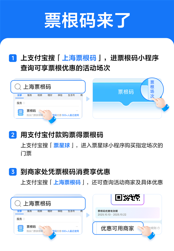 上海用户上支付宝App搜索"上海票根码",或关注"上海市服务消费促进会"公众号,可查询优惠可用商家及优惠信息,线下商户处也会有"上海票根码"Logo露出。票根码有效期内可反复使用。