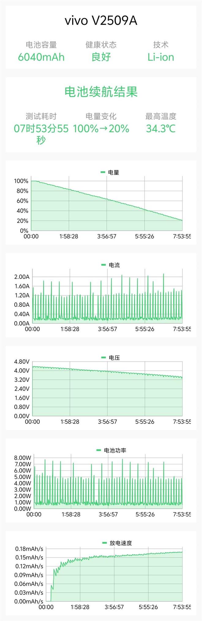 我们使用电池狗狗对vivo X300手机进行续航测试,在默认的100%-20%电量续航测试中,vivo X300手机搭载的6040mAh第二代半固体电池跑出了7小时53分钟的成绩。