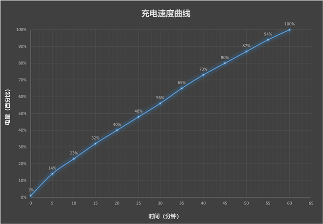 之后我们将vivo X300手机电量消耗到1%,只用原装充电器进行充电,并记录充电曲线,可以看到vivo X300手机的充电速度相当平稳,5分钟可以充到14%的电量,60分钟以内就可以完全充满。