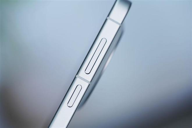 机身左侧的音量键和电源键,可以看到我们这台自在蓝配色的vivo X300的金属边框,同样是浅浅的蓝色。