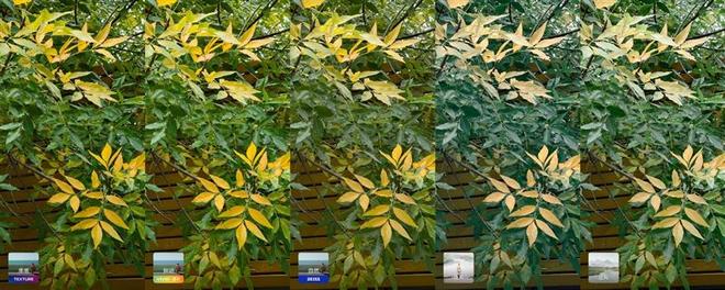 这里我们对对同一场景使用了质感、鲜明、自然三种基础风格滤镜和负片正面两种个性化风格滤镜拍摄,对比效果。可以看到个性化风格滤镜确实风格更加强烈,色彩还原也不再力求真实,特别是负片滤镜,有强烈的 富士胶片模拟风格,绿色表现十分特别。