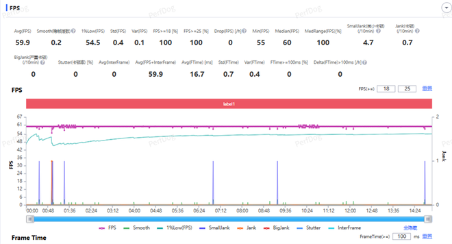 结果显示平均帧数59.9FPS,稳帧指数0.2,1%LOW帧更是有惊人的54.5FPS!