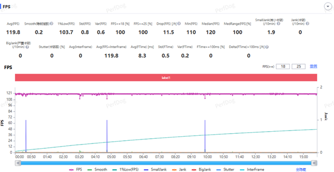 游戏平均119.8FPS,稳帧指数0.2,1%low帧有103.7FPS。