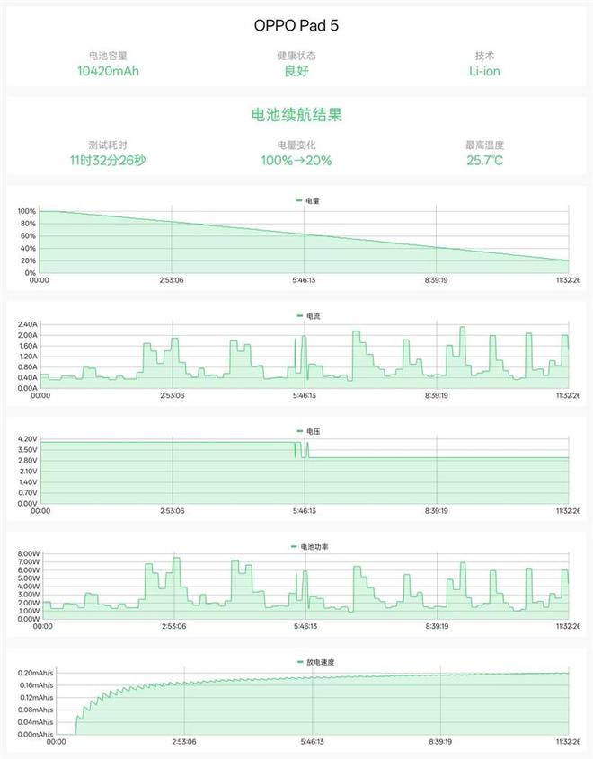 经过电池狗狗的测试,OPPO Pad 5达成了11小时32分钟的成绩,理论满电续航为14小时25分钟。作为平板来说续航成绩相当不错。