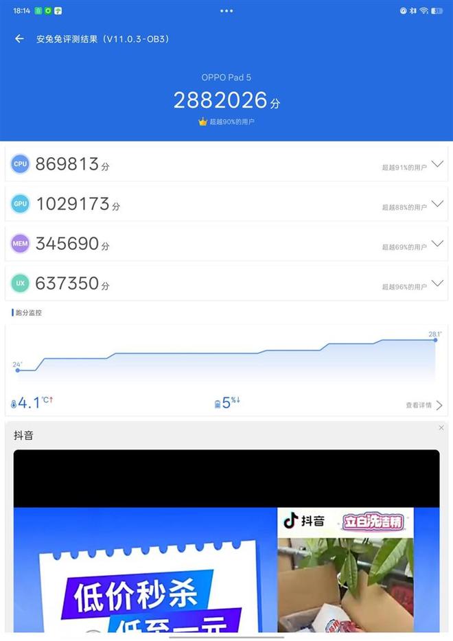 安兔兔跑分达到288W,其中CPU+GPU分数达189W。