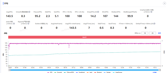 平均游戏帧数143.5,稳帧指数0.3,1%low帧95.2,超级顺畅的体验。