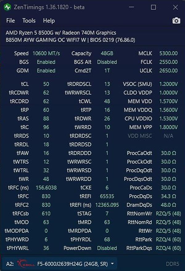 在此次测试中,华硕B850M AYW主板搭配Ryzen 5 8500G处理器,成功将48GB DDR5内存(2×24GB)的频率提升至10600MT/s,延迟仅为CL34。