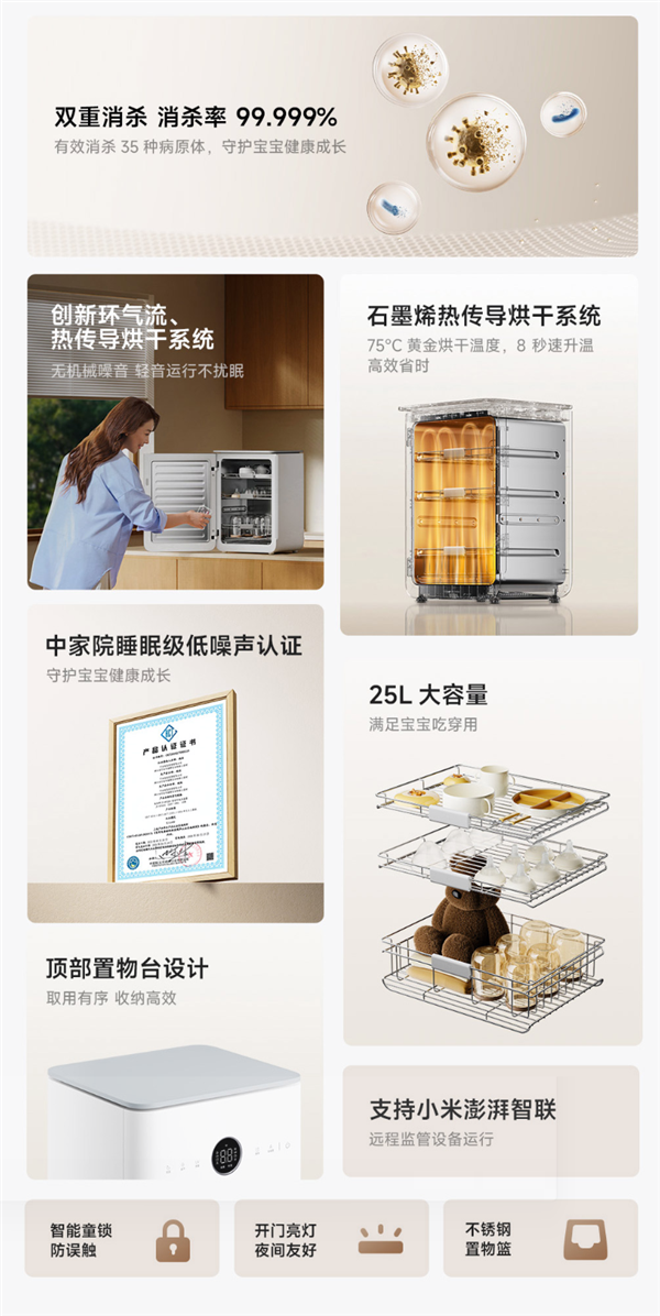 提供25L超大空间,搭配食品接触级304不锈钢置物篮,可一次消毒奶瓶、辅食碗勺、玩具等宝宝用品。