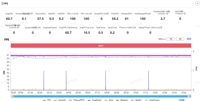 平均帧数为60.7FPS,稳帧指数0.1,1%low帧57.5FPS,1% low 帧在我们所有测试机型中是最高的。