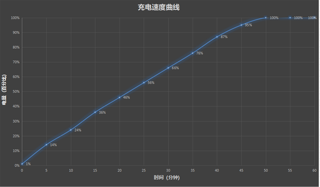 5分钟充入14%,10分钟充入24%,20分钟充入46%,半小时充至66%;UI显示充满100%用时51分钟,最终停止充电总用时1小时1分。