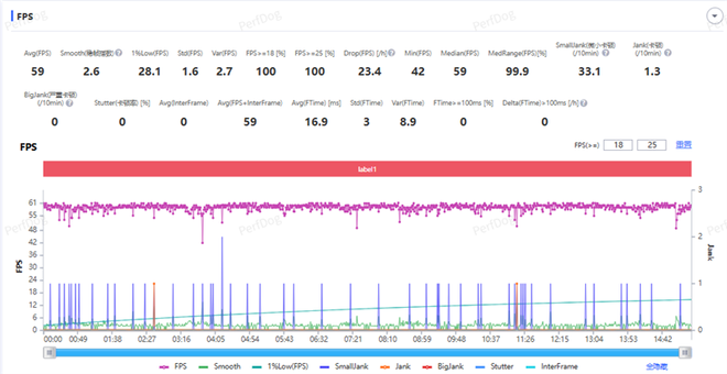 实测结果显示为平均59FPS,稳帧指数2.6,1%low帧28.1FPS。