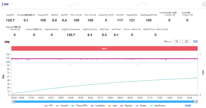 实测结果显示,Find X9能够轻松的跑满120帧,平均帧数达到120.7FPS,稳帧指数0.1,1%low帧达到109FPS。