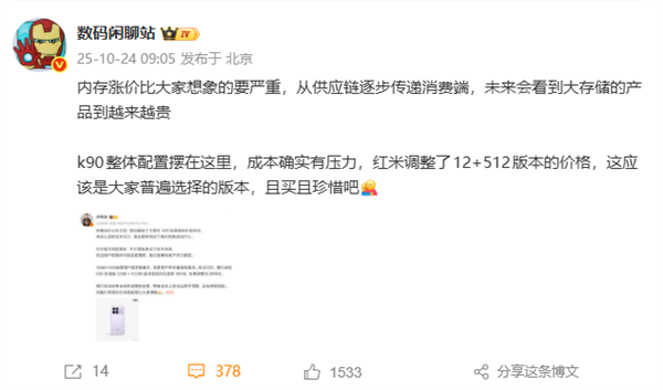 REDMI K90 12+512GB降价!雷军:最近内存涨价实在太多 希望大家理解这份诚意