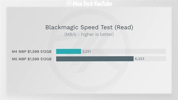然而最新的测试显示,其固态硬盘速度也有着大幅提升,对比M4 MacBook Pro,读写速度最高竟提升了211%。