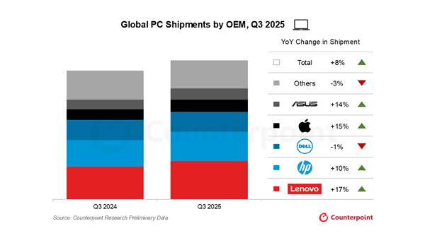 根据Counterpoint Research的报告,在2025年第三季度,全球PC市场整体同比增长了8.1%,这波增长的主要驱动力来自于两个方面:一是用户需要升级硬件以兼容Windows 11;二是为了对冲美国高额进口关税的风险,公司提前囤积了库存。