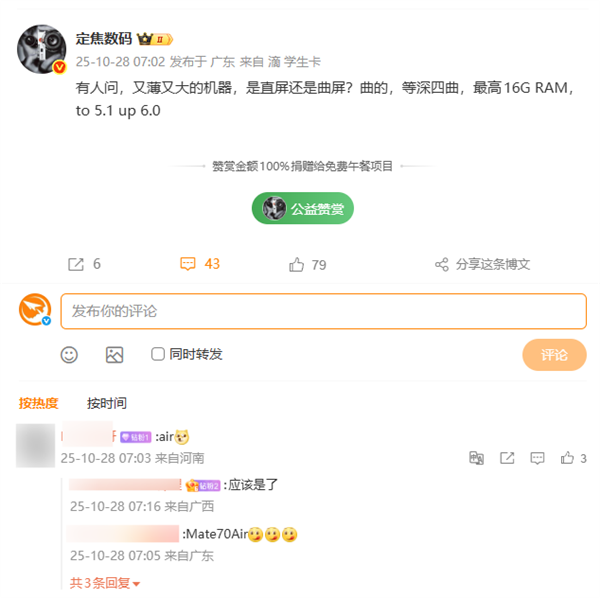 今日,数码博主"定焦数码"曝光了一台"又薄又大的机器",从微博内容和网友评论来看,该机正是华为Mate 70 Air。