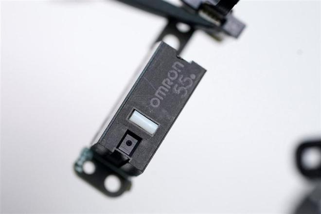 左右键使用的是来自欧姆龙的白点机械微动开关,规格为D2FC-F,压力为7N,中国制造,寿命长达一亿次点击(100M),手感清脆反馈清晰。