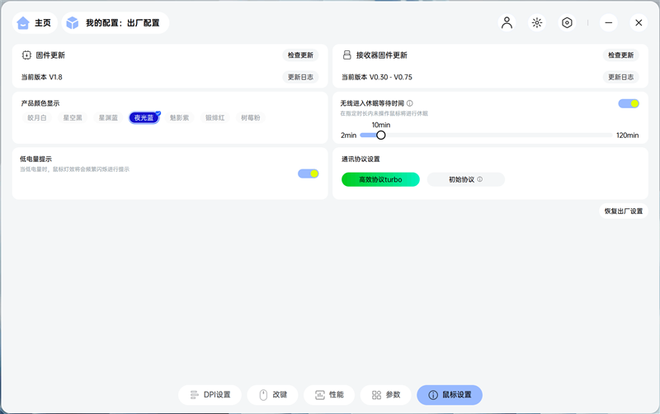 我们首先把雷柏的A-Hub软件和雷柏VT7金属漆鼠标以及接收器都升级到最新版,就可以看到右下放多出了一个通讯协议设置,默认就是新的高效协议turbo,同时新的三款金属漆配色也出现在左侧产品颜色显示中。