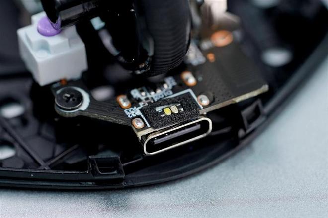 雷柏VT7金属漆鼠标的USB-C充电接口特写。