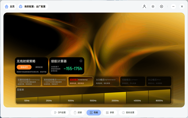 狂暴竞技模式等之前只有MAX系列才能启用的性能模式,现在也全面开放给了VT7系列,NORDIC 54芯片在新版Power+炎龙固件的精细调校下,性能更强能耗更好,同样是800mAh电池,在狂暴竞技模式+8000Hz回报率+满格射频这种最极限的性能释放下,也能连续工作75个小时。