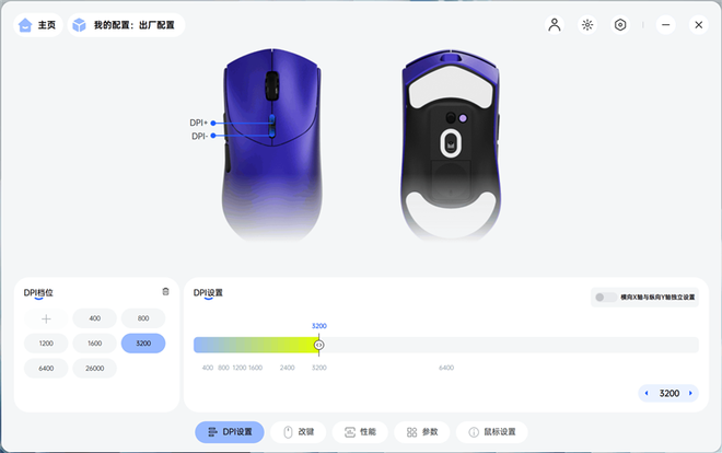雷柏VT7金属漆鼠标在A-Hub软件中,DPI设置、改键和参数页面功能都完整开放,最高DPI可以支持到26000。