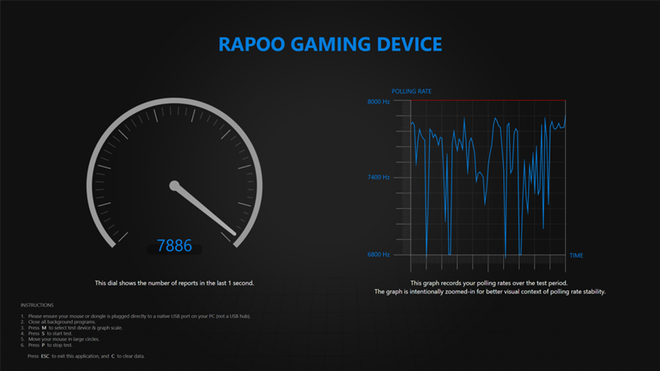 我们用雷蛇公司的PollingRateTesterApp软件对雷柏VT7金属漆鼠标进行了测试,8K回报率下实测回报率轻松超过7800,已经十分接近8K的极限。
