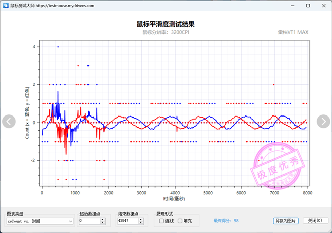 我们也用鼠标测试大师对雷柏VT7金属漆鼠标的平滑度进行测试,获得了极度优秀的评价。