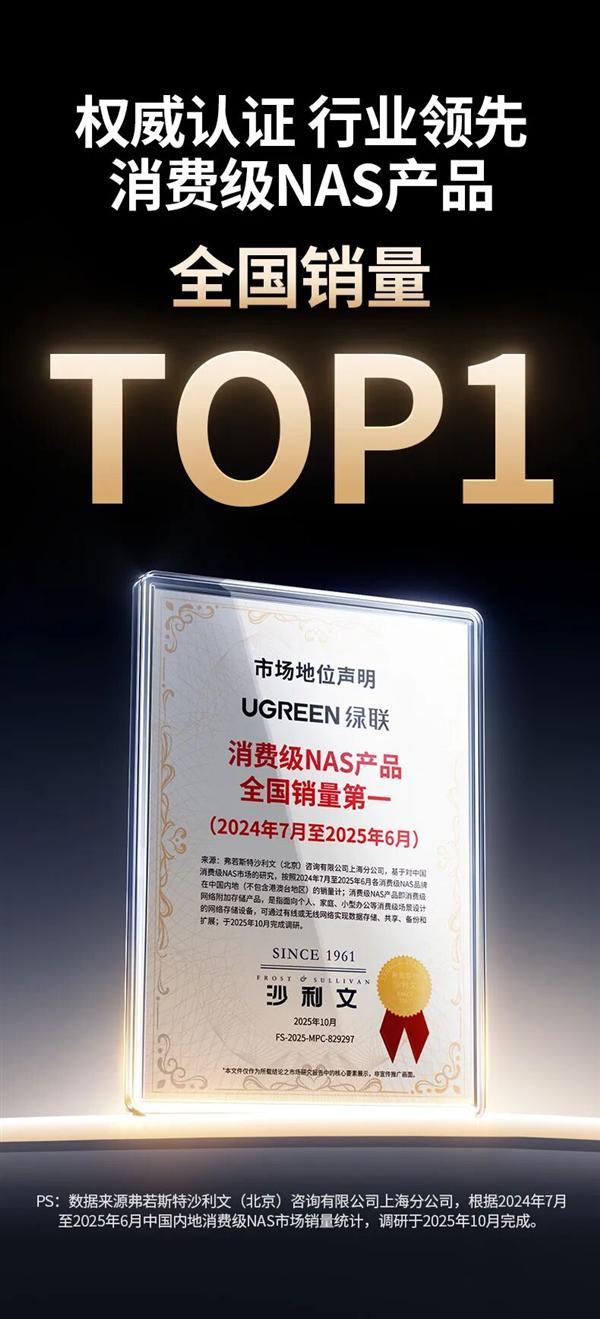 10月28日消息,近日,绿联科技获得全球权威咨询机构弗若斯特沙利文(Frost & Sullivan)颁发的"消费级NAS产品全国销量第一"市场地位声明。