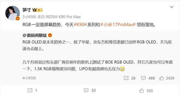 该博主还爆料,有头部厂商在明年的新机上测试了京东方RGB OLED,其它几家也可以考虑一下,1.5K RGB精细度没问题,LIPO和超高刷也无压力。REDMI产品经理笋寸表示,RGB一定是屏幕趋势,今天K90系列和小米17 Pro Max领衔落地。
