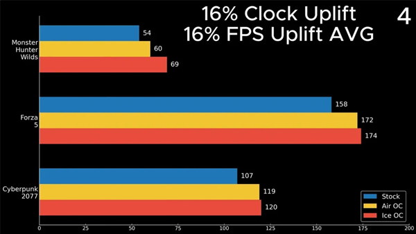 游戏方面,在三款游戏(《怪物猎人:荒野》、《极限竞速:地平线 5》、《赛博朋克 2077》)中,防冻液冷却下的B580相比默认配置,平均提升了6%。