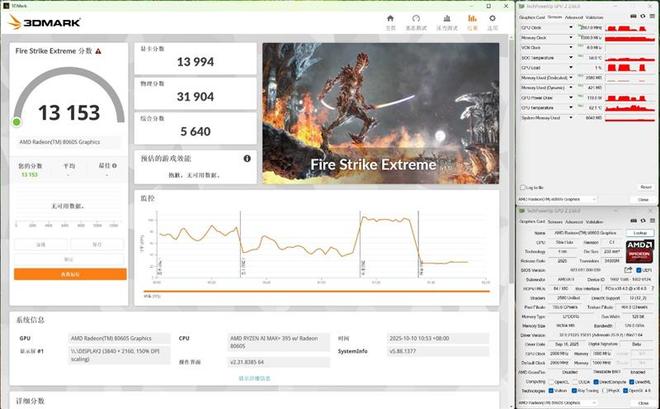 在3DMark Fire Strike Extreme测试中,RADEON 8060S图形分数为13994分,核心温度最高82℃,核心运行最高频率为2867MHz,显卡最大功耗120W。