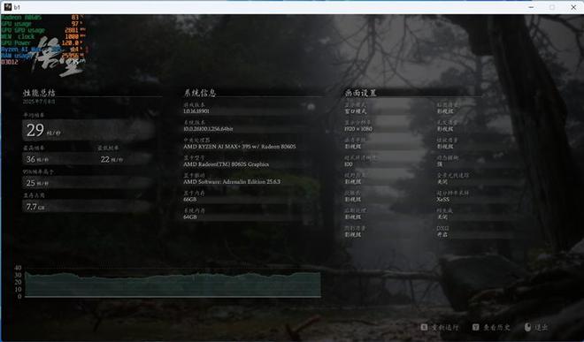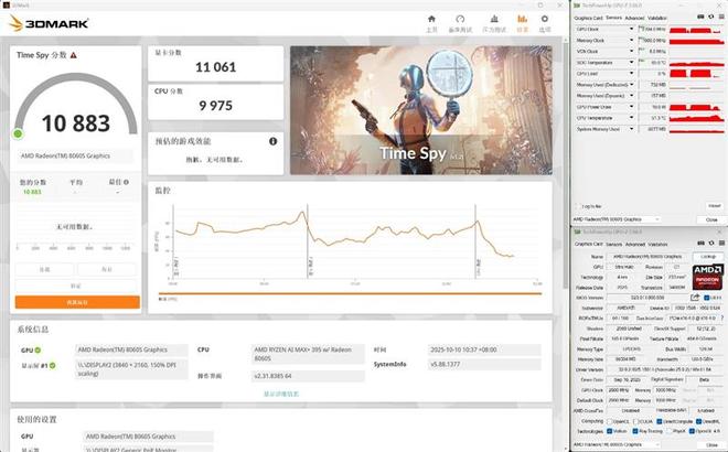 在2K分辨率3DMark Time Spy测试中,RADEON 8060S图形分数达到了11061分,核心运行最高频率为2704MHz,显卡最大功耗120W、最高温度82度。