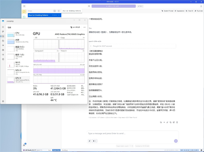 我们试着让Deepseek模仿杜甫的《登高》,为黄鹤楼创作一首七言律诗,生成速度为9.62 tokens/s,总计耗时1分钟。